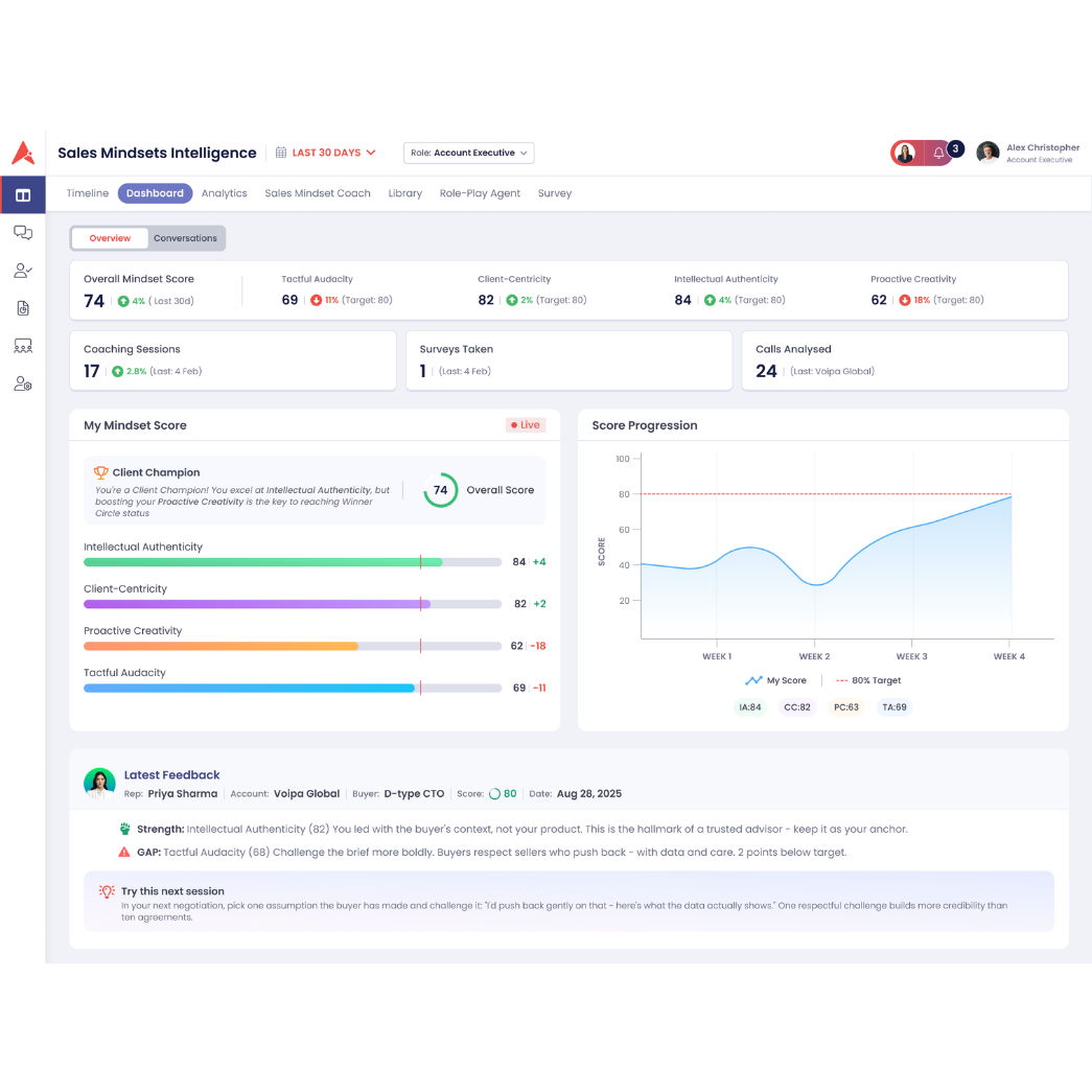 The Sales Mindsets Intelligence Studio is designed to close that gap. It uses Aviso's AI to draw consistent feedback from recorded customer conversations and provide quantifiable measurement for how well salespeople are selling on every call.